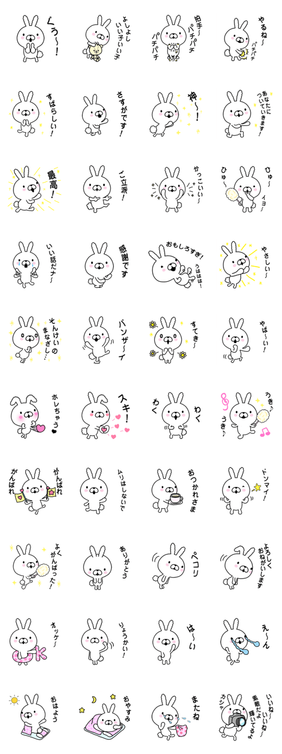 ほめ言葉+よく使う日常会話スタンプセット。フワフワの耳とシッポは綿菓子で出来ているウサギさん。普段ほめにくいこともスタンプで。以前発売していた改訂版。