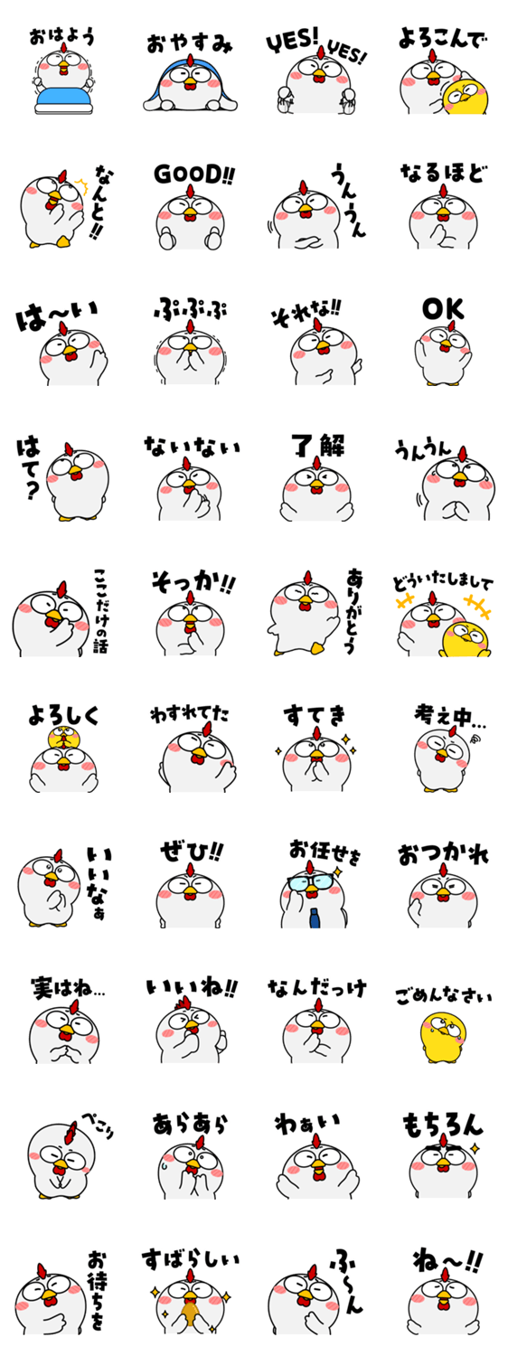 キュートなニワトリ。毎日使える、ずっと使える、よく使う言葉を揃えました。あいづちがたくさん。家族にも、友達にも、同僚にも。ヒヨコもいるよ。