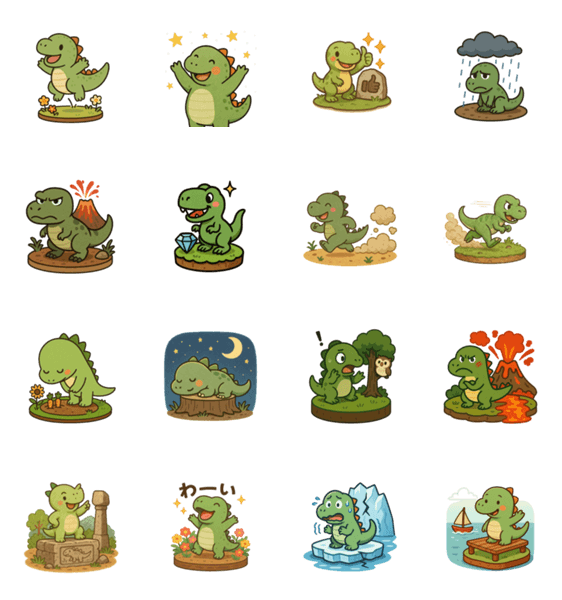 | スタンプ説明 | Tiny dinosaurs express every feeling inside their cute little dioramas! Perfect for kids and families. Fun without any text. |