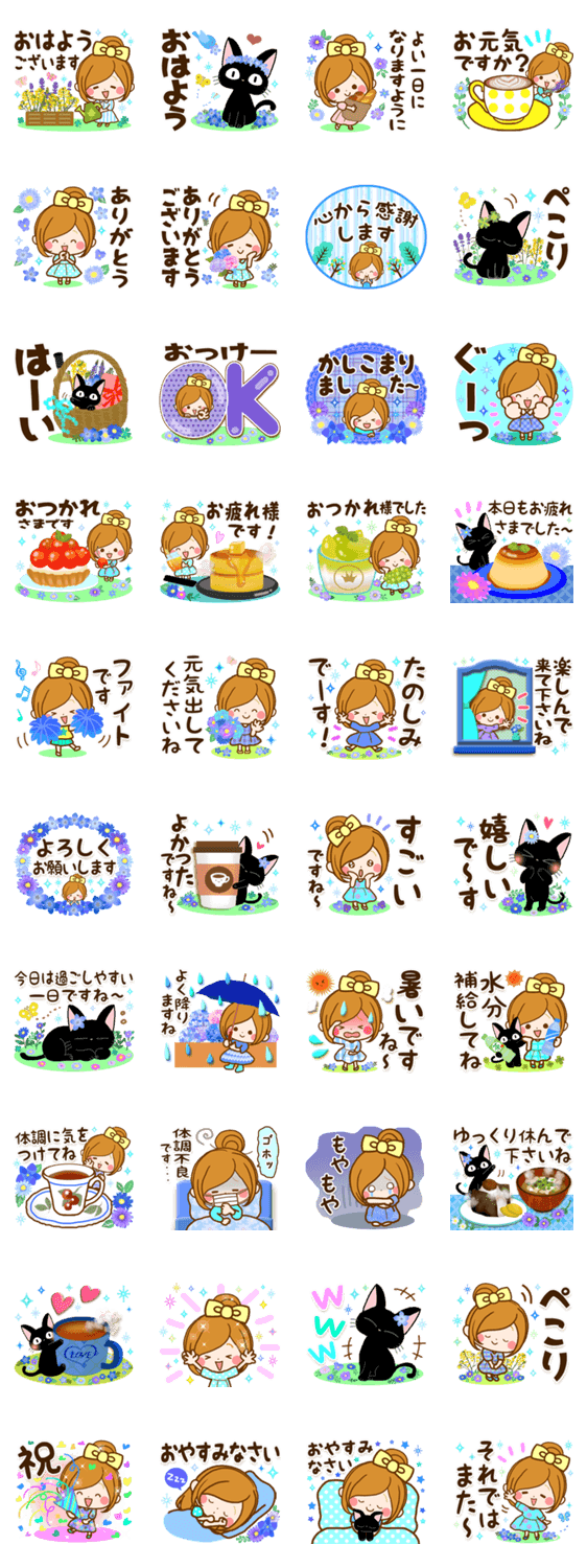 さわやかで綺麗な色合いの夏にむかって使える日常敬語スタンプです♪お花がいっぱいで癒やされるデザインに♡/ほのぼのカノジョ/黒猫/誕生日/暑い/雨/花/ママ友/友達/梅雨