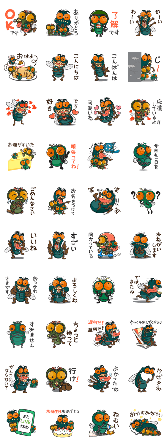 | スタンプ説明 | いたずらなハエの家族 。不器用なお父さんと3人の小さな子供たち。私たちはあなたが思っているよりもかわいいです。私たちを憎まないでください。 |
