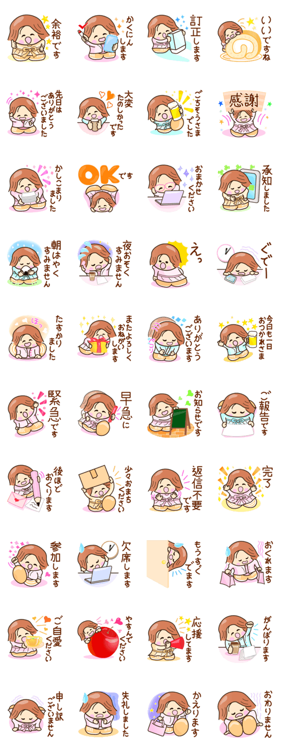 ☆元気で明るい☆ビジネスの場にも使える敬語のスタンプです。 訂正します/先日は、ありがとうございました/夜おそくすみません/今日も一日おつかれさま/完了などです。