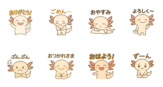 「ありがとう」から「ぷんぷん」まで、かわいいウーパールーパーがあなたの気持ちをゆるっと代弁します。
