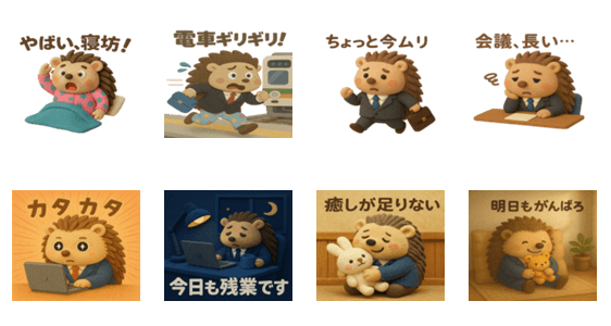 | スタンプ説明 | 「一生懸命な姿がなんだか可愛い!バタバタ社会人“ハリネくん”で共感トークしませんか?」 |