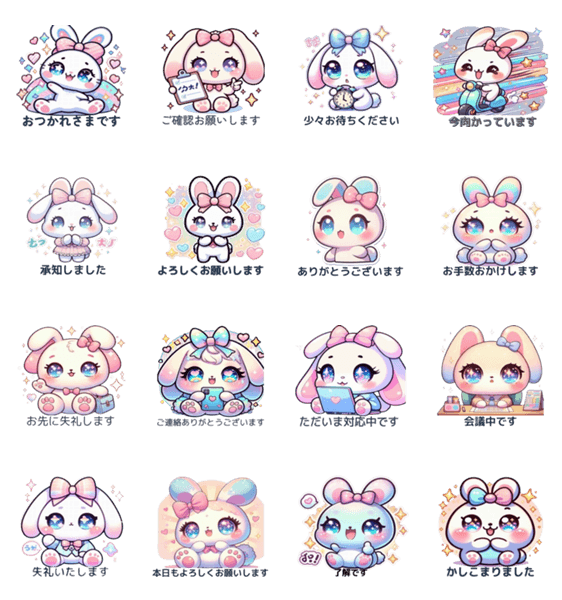敬語でやさしくリアクションしてくれる、うるうる目のかわいいうさぎスタンプです。仕事でもプライベートでも使いやすい!