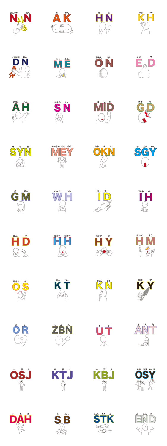 アルファベットの頭文字でひとこと申すスタンプです。関西弁のヤツを作ってみました。MNSN(みなさん)TTY(つかってや) YRSK(よろしく)