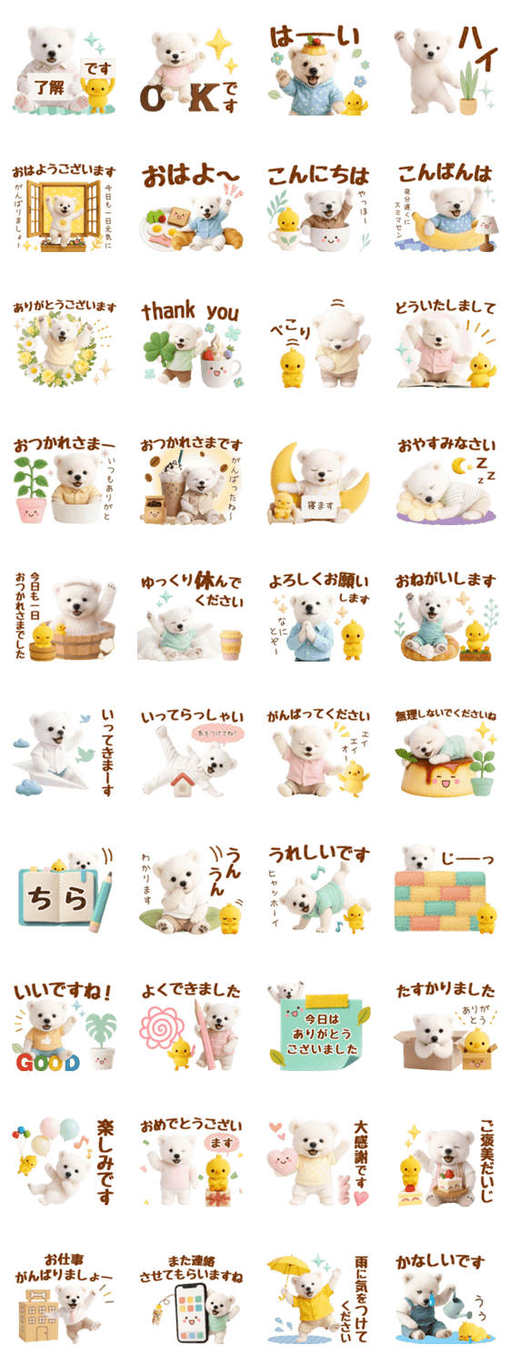 かわいい子犬の堅苦しすぎないゆるい敬語スタンプです。友達やお仕事でも使いやすい毎日づかいのフレーズ中心。挨拶/一年中/敬語/気遣い/大人可愛い/白熊/しろくま