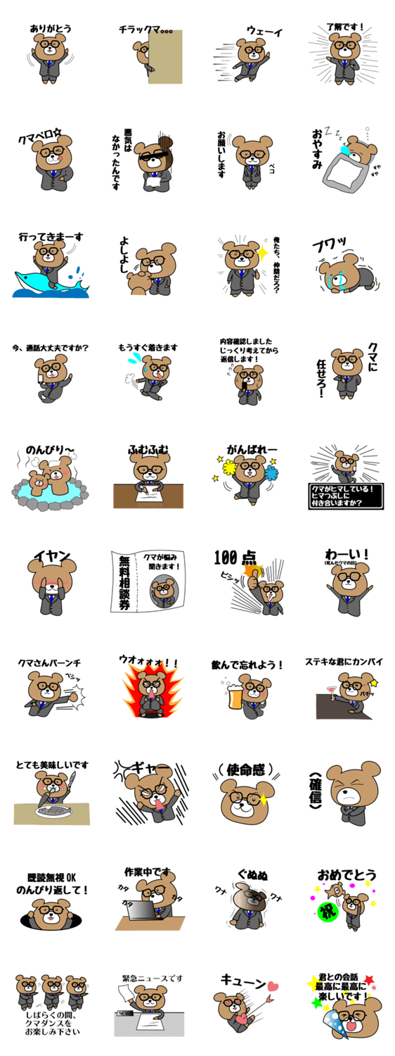 都会で仕事するクマ社長のスタンプだよ!プライベート、仕事、SNS、色々と使えるかも!仲良くなりたい人に向けて使ってください!