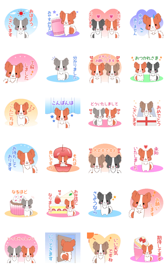 小さいパピヨンたちのスタンプ第17弾。レッド/セーブル/ブラウン/ブラック/カワイイ/可愛い/キュート/犬/イヌ/もふもふ/モフモフ/挨拶/シンプル