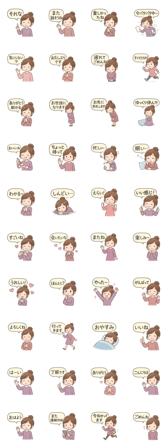 | スタンプ説明 | ほんわか大人女子の日常会話のスタンプです。 日常/毎日/日々/セリフ/挨拶/謝罪/気持ち/励まし/連絡/営業/主婦/女の子/家族 |