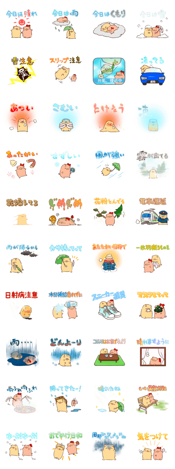 今日のお天気や気候をお知らせするスタンプです。白ぶたの男の子ぶぶと桃色ブタの女の子あば第10弾。