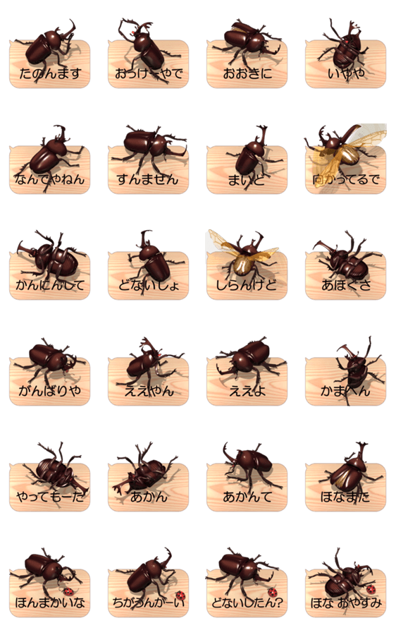 | スタンプ説明 | カブトムシがスマホの上で動いているように見える(関西弁バージョンの)ポップアップスタンプです。 |