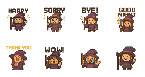 かわいくて使いやすいピクセル魔女のスタンプパック! レトロな魔法で日常の気分を表現。面白くて感情豊か、すべてのチャットにぴったり!
