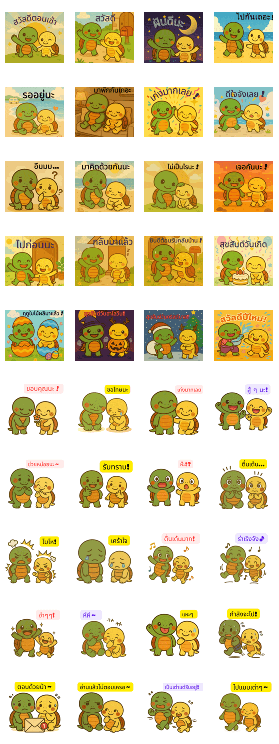 | スタンプ説明 | Pomotan" and "Pokotan," the relaxing turtle siblings, add a warm and gentle touch to your chats! Perfect for greetings, encouragement, and everyday messages. |