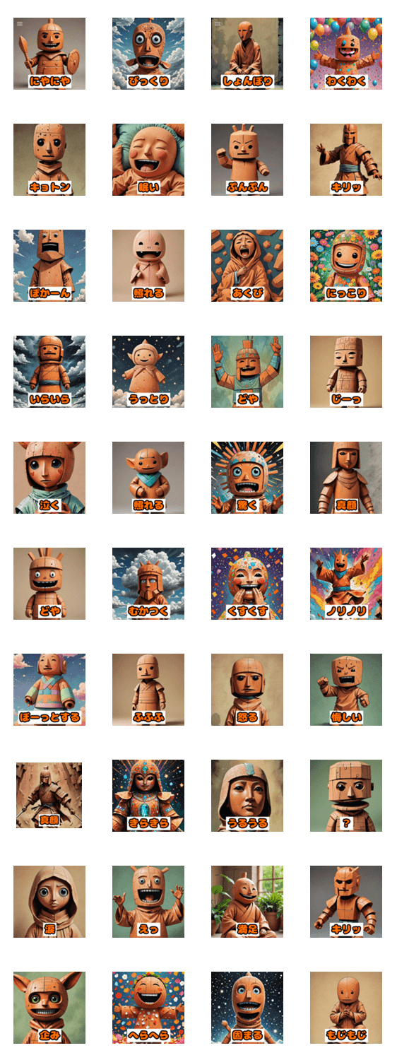 | スタンプ説明 | 感情ダダ漏れのぶじんくんが、あなたの気持ちを全力で代弁!思わず笑っちゃう、ゆるシュールな埴輪スタンプ40種。 |