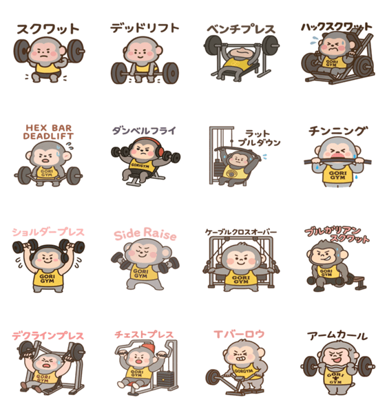 | スタンプ説明 | レッグプレス、デッドリフト、ベンチプレス! トレメニューがそのままスタンプに。 筋トレ民必見の“ゴリさる”で、ジム報告ももっと楽しく! |