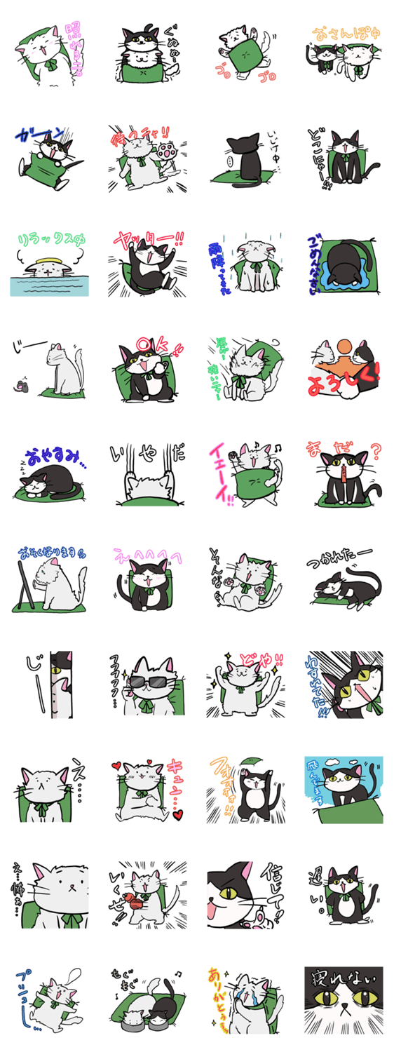 これは、白猫と黒猫が座布団を背負っているスタンプです!座布団猫たちが、あなたの言いたいことを代わりに伝えてくれます!