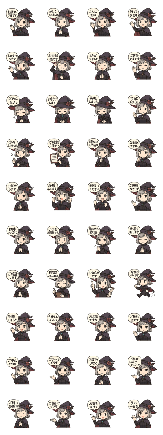 | スタンプ説明 | 礼儀正しい魔女の日常会話のスタンプです。 まじょ/マジョ/日常/毎日/日々/挨拶/謝罪/気持ち/励まし |
