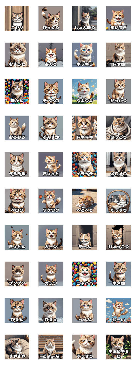 40種類のマンチカンの表情を集めたスタンプセット。日常会話や気持ちの表現に使ってね!