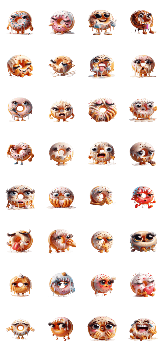 | スタンプ説明 | "ドーナツを擬人化した女の子、誘惑とユーモアが詰まったLINEスタンプ、かわいくて楽しい、 |