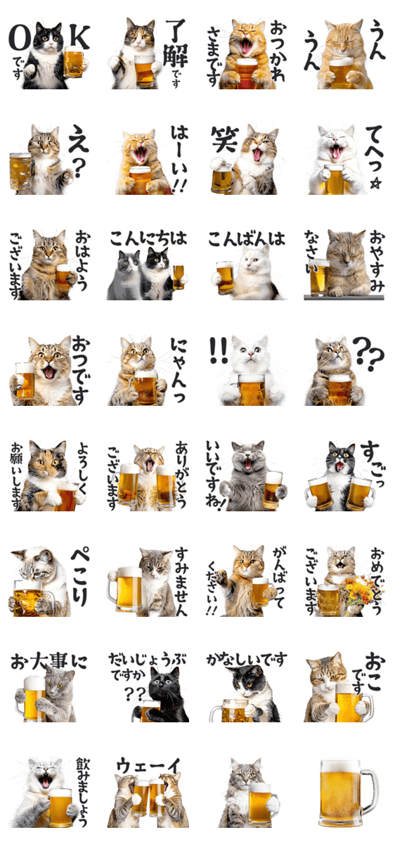 リアルな酒ビール猫ミーム可愛いネコの写真で返事。会社学校の先輩に毎日使いやすい挨拶使える定番面白いゆるい業務連絡。食べ物飲み会推しねこ動物大人男子女子におすすめ