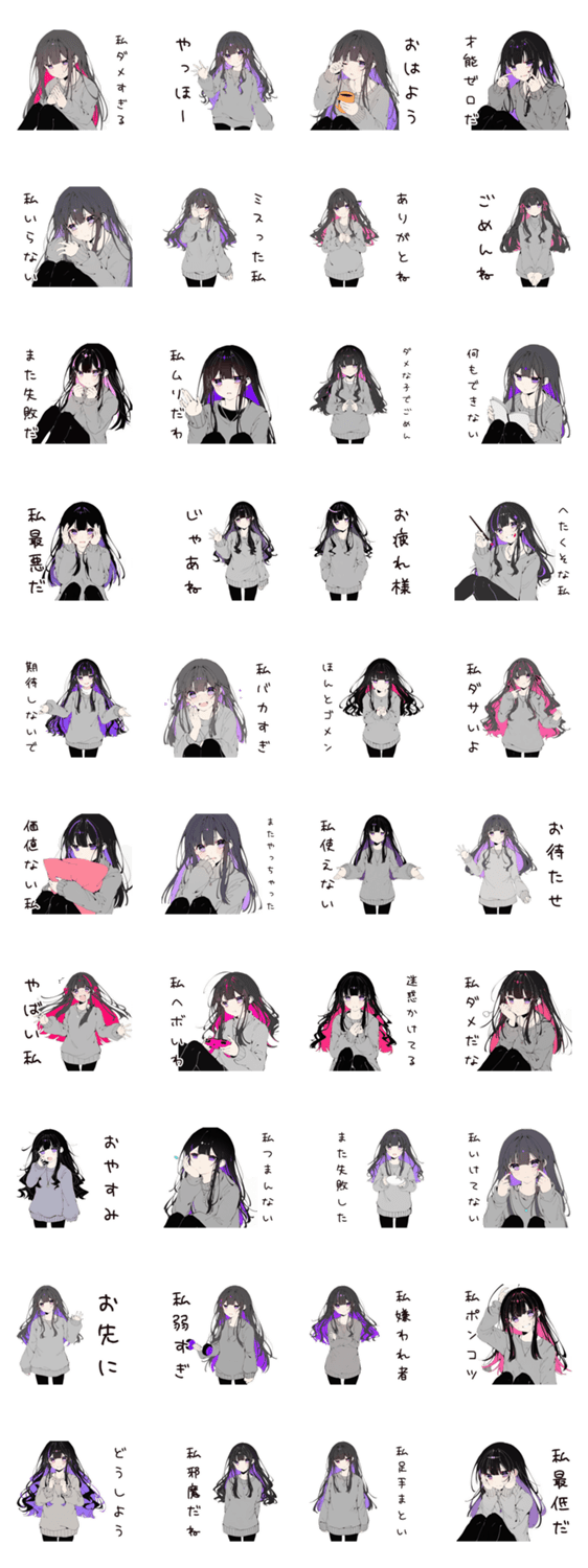 自己卑下しちゃう女子にぴったり!ちょっと切ないけど面白いスタンプ。可愛い/自虐/ネガティブ/女子/日常/笑い/共感/会話。