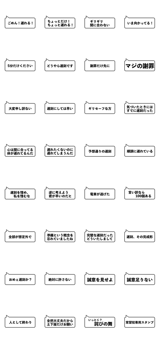| スタンプ説明 | 遅れた自分も、遅れたあいつも、まとめてスタンプで処理しよう。 |