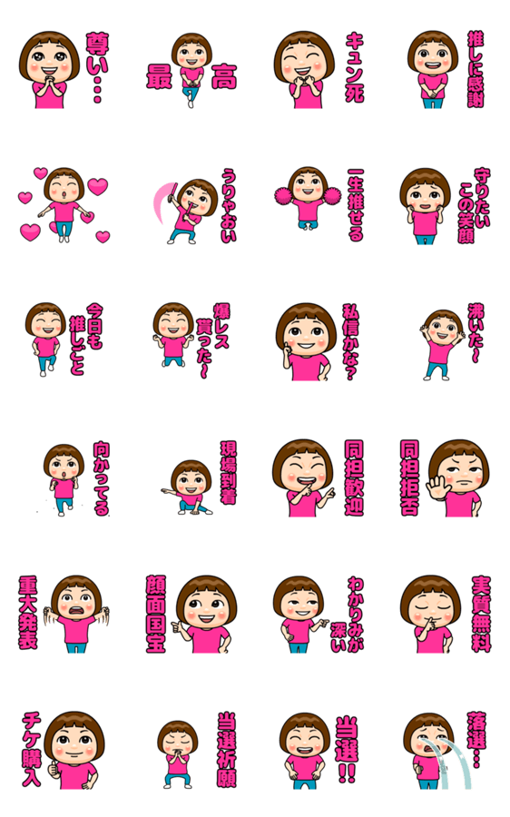 担当カラーがピンクの推し活専用スタンプです。推しのアイドルへの想いや、ライブの感想、チケットの当落等、推し仲間との会話に最適♪芋ジャージの名前スタンプのくーが作