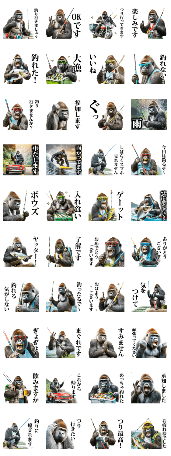 | スタンプ説明 | 釣りが大好きなゴリラです。いつも魚釣りの事ばかり考えてるフィッシングゴリラのスタンプです |