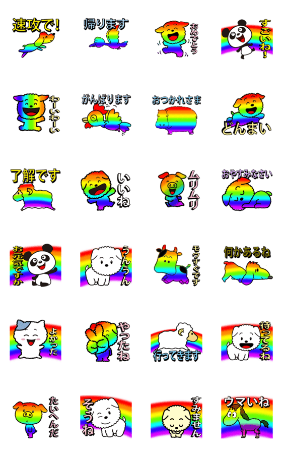 かわいい七色の虹の犬と動物達のアニメーションスタンプです。