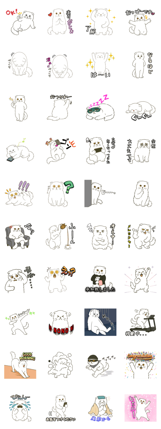 ぽっちゃり系な白猫さんで、 日常でも使えるスタンプになっています。