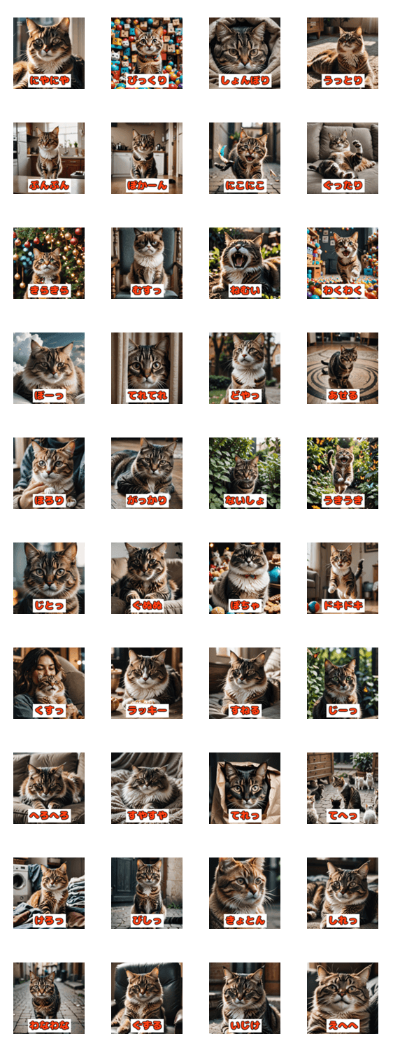 ネコってこんなに表情豊か!にやにや・しょんぼり・ドヤ顔まで、感情ぜんぶおまかせあれ。毎日の会話に“にゃん”と使える猫スタンプ♪