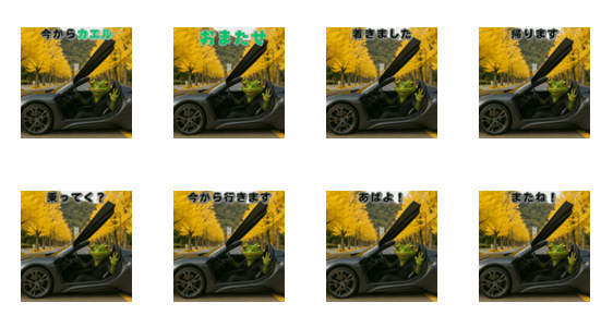 オープンカーに乗ってごきげんに挨拶するカエルのスタンプです。日常使いにもおすすめ!