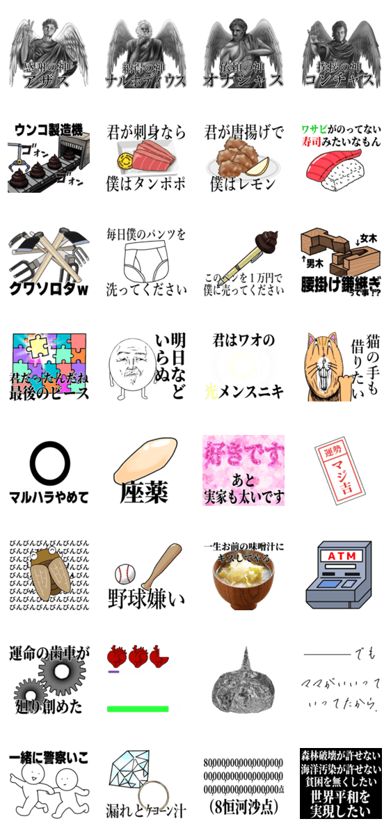 | スタンプ説明 | 【セット/前向き/伝える/愛/告白/ハッピー/ロマンチスト/腰掛け鎌継ぎ/神/食べ物/木材/便利/手書き/イラスト/鍬/唐揚げ/レモン/猫/納得/感謝/天使/アソート/その他】 |