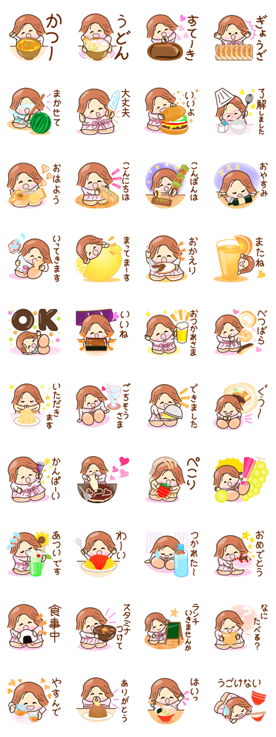 ☆元気でゆるーい☆ グルメのスタンプです。日常やビジネスの場面でつかいやすいです。かつー/まかせて/うどん/ぎょうざ/べつばら/ぐう~/食事中/ランチいきませんか?等