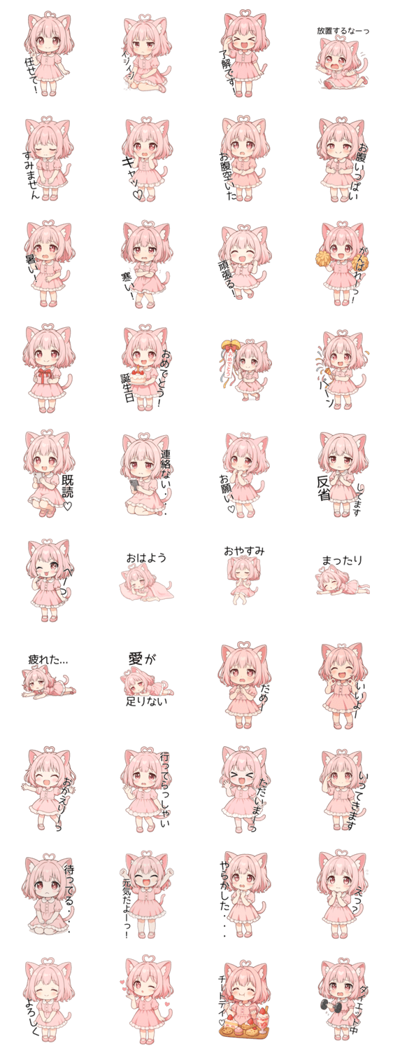 猫耳ワンピースピンクの女の子!可愛い、ちびキャラ、ミニキャラ、日常、感情、毎日使える、ハート ※このスタンプはトークルームで大きく表示されるBIGスタンプです。