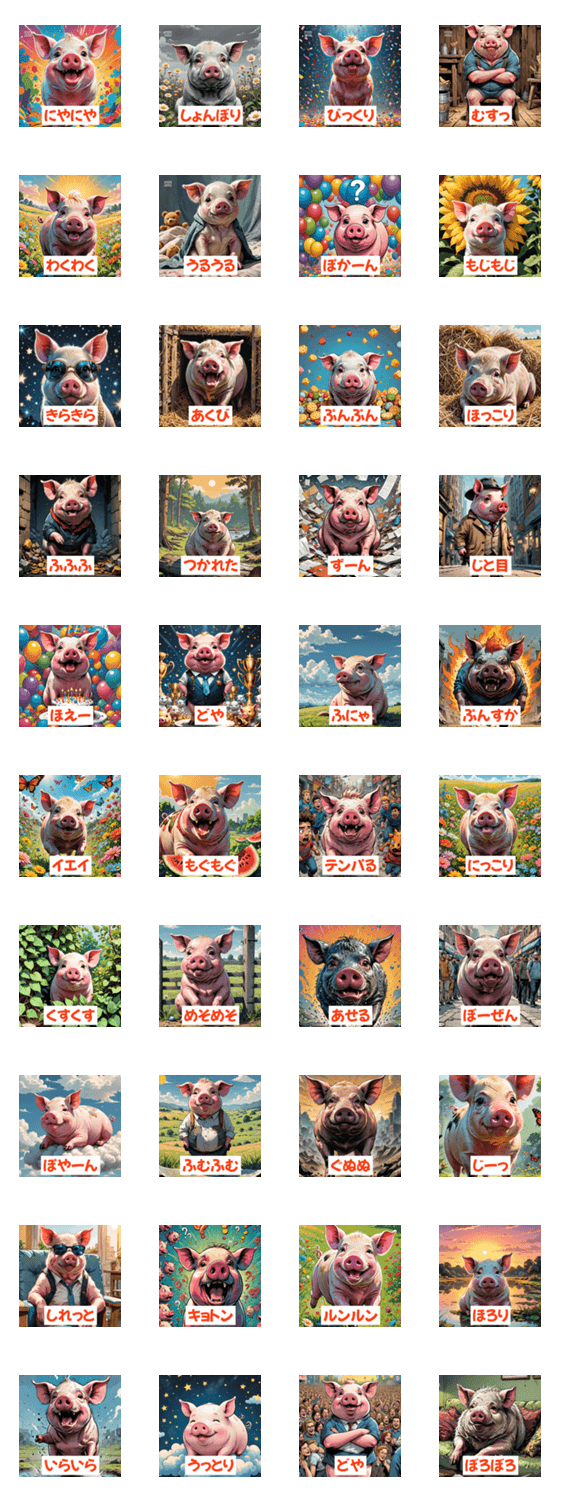 毎日つかえる!ニヤリ、ぷんすか、しょんぼり、ドヤ顔…感情たっぷりの「ぶた」があなたの気持ちを代弁してくれます。 ゆるかわ系です。