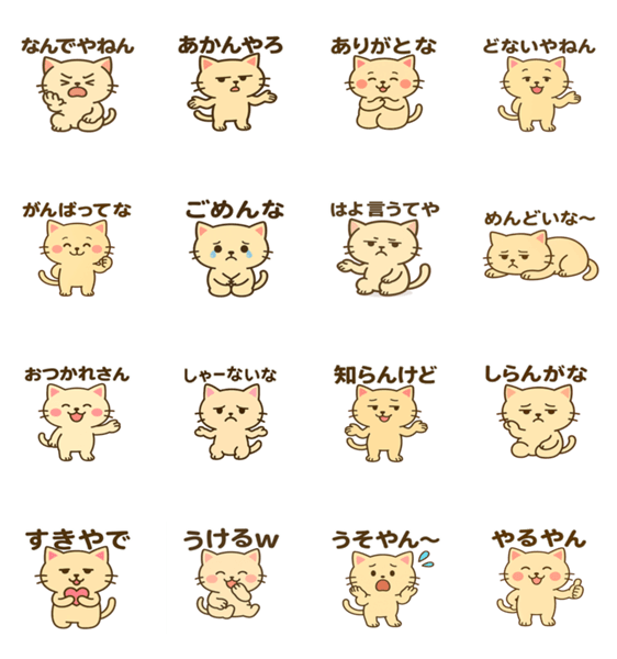 | スタンプ説明 | 関西弁のねこがツッコミや応援、癒しを全16種類でお届けするスタンプセットです |