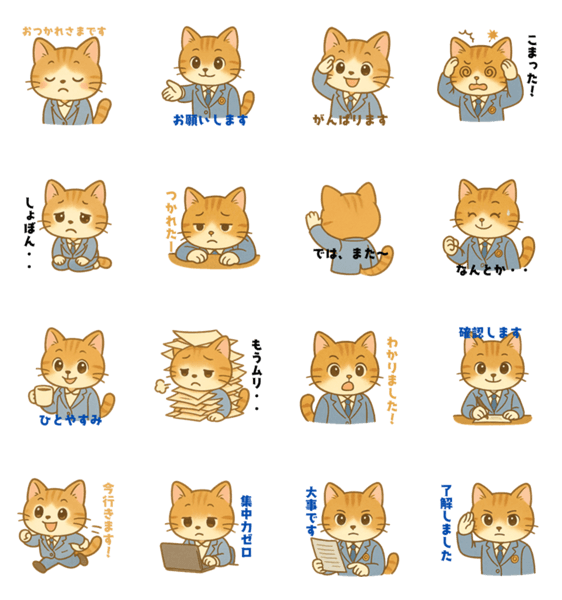 ゆる〜くがんばるねこ課長。仕事の合間に使いやすいスタンプです。