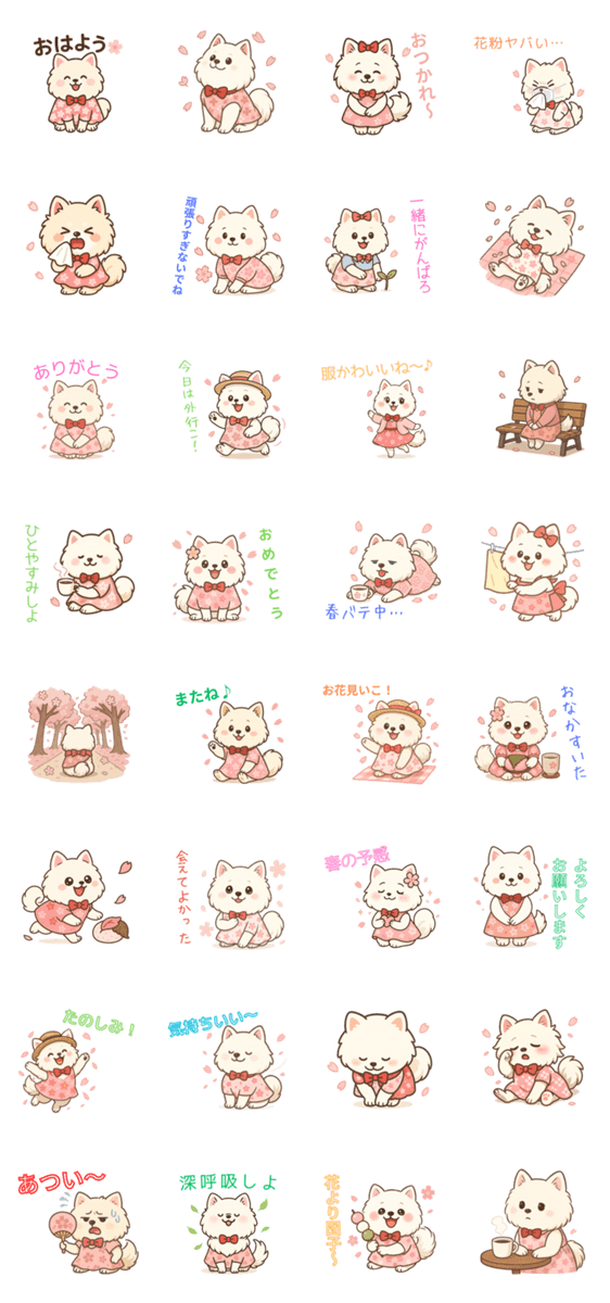 | スタンプ説明 | 桜柄の衣装をまとった白ポメが、春のぬくもりと優しい気持ちを届けます。癒し・感謝・共感など、心にそっと寄り添うスタンプです。 |