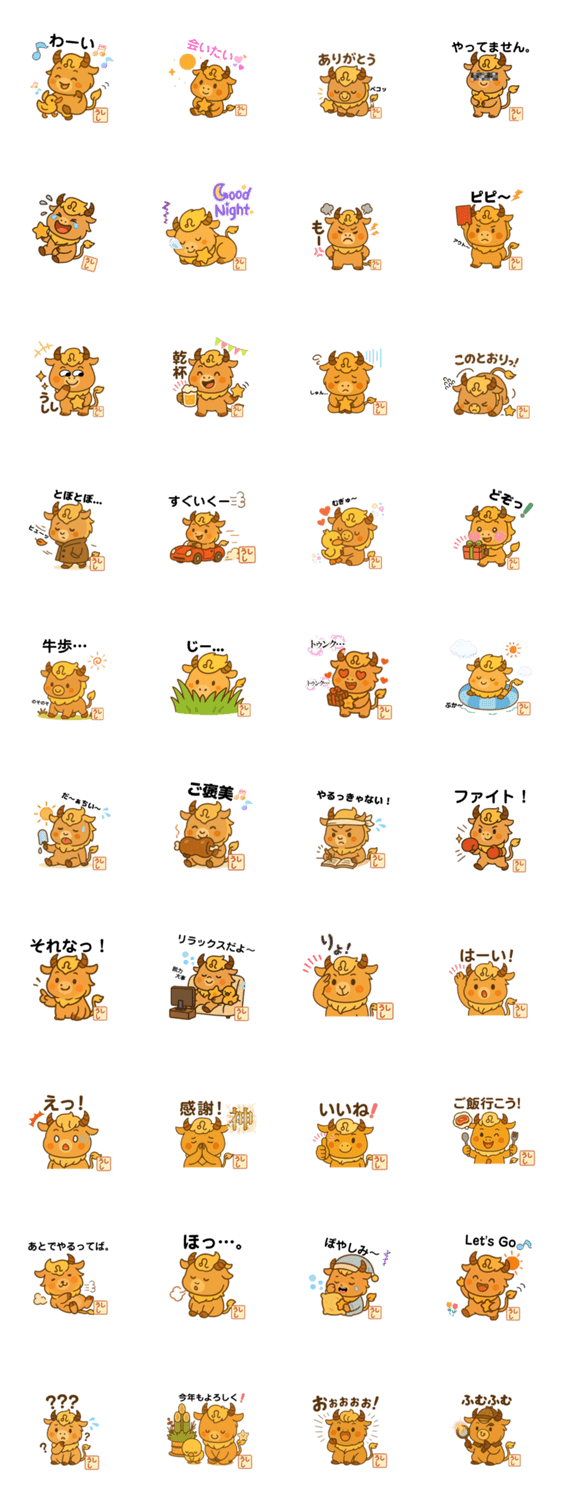 | スタンプ説明 | 牛 (丑)とライオン (獅子)の「うしし」です!日常で使えるスタンプ取り揃えております!丑年の人も、獅子座の人も是非チェックしてね♪ |