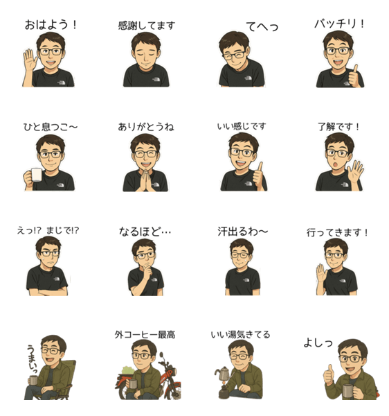 カフェ山さんはコーヒーとキャンプと自然が大好き。ゆるやかで癒されるスタンプセットです。文字なしでも気持ちが伝わります。