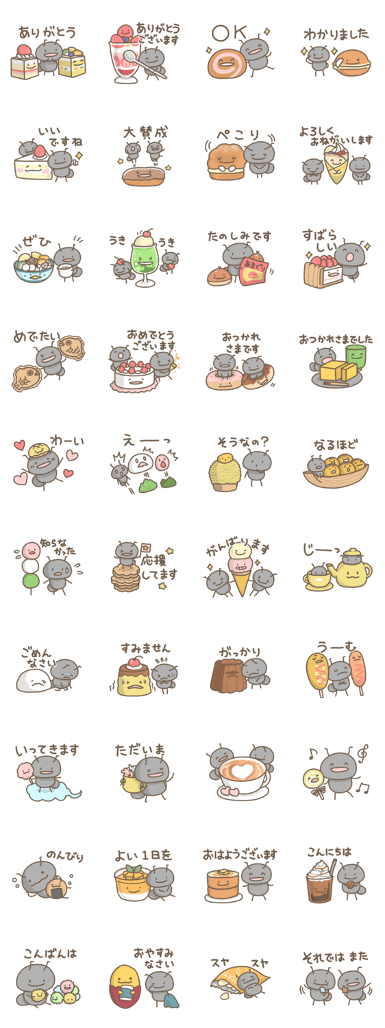 昆虫の仲間たちから、蟻です。スイーツや和菓子など、おやつがたくさん。