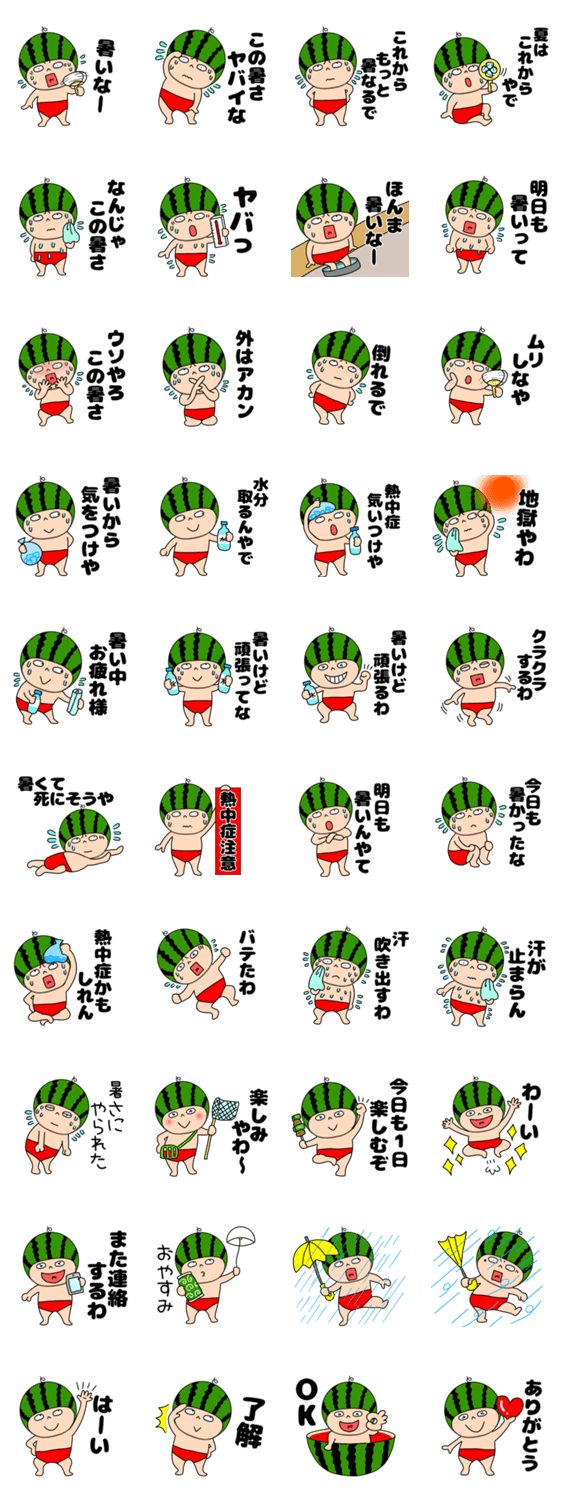 夏前から成に向けて暑い日につかえる可愛いスイカを被ったキャラクターのスタンプです