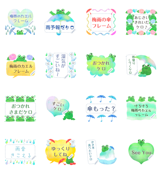 文章が書き込めるのでいろんなトークができちゃう★ ほんわかオーロラカラーのカエル・梅雨の傘・てるてる坊主・紫陽花・ハートがゆるかわいいメッセージスタンプです♪ 現在この商品は一部のスマートフォン版LINE 10.3.0以上のトークルームでのみ使用できます。動作環境の最新情報はヘルプをご確認ください。