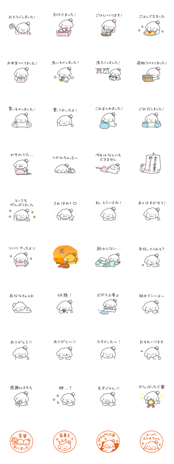 | スタンプ説明 | このスタンプでがんばったことをアピールしましょう!主婦・主夫の方はもちろん、一人暮らしの励まし合いにも。(夫婦/同棲/カップル/恋人/妻/夫/犬/イヌ)#しろいぬちゃん |