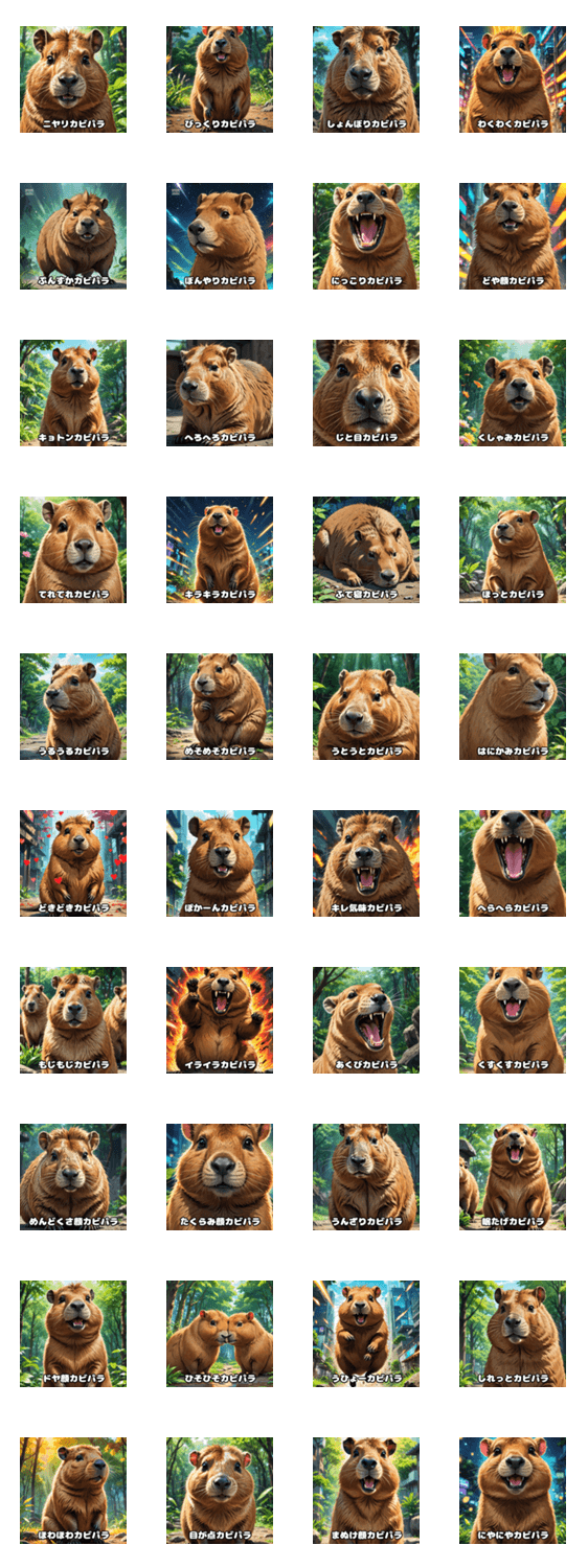 ニヤリ、ぷんすか、うとうと…。感情豊かなカビパラが、あなたの気持ちをかわいく届けます。40種