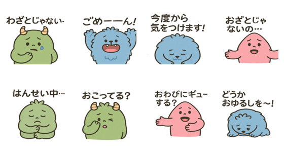 | スタンプ説明 | Cute monsters will say "I'm sorry" in your everyday life! These are gentle and lovable apology stamps. |