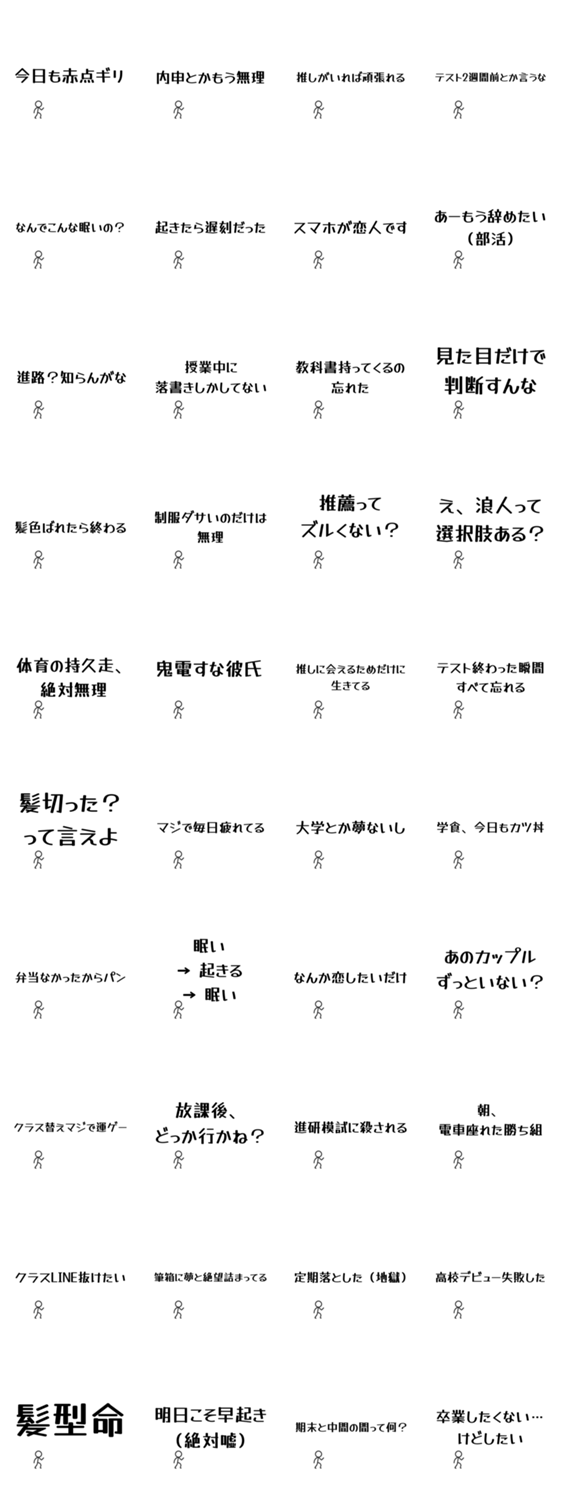 | スタンプ説明 | 進路、恋、睡眠不足――これが高校生。リアルな棒人間が送る“それな”の連続。元高校生も思わずうなずくネタ満載。 |