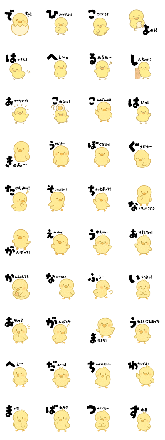 | スタンプ説明 | ゆるっとしたひよこが、毎日の気持ちをかわいくお届け。日常でよく使えるセリフがたっぷり。毎日のトークにほっこり癒しをどうぞ♪第二弾。 |